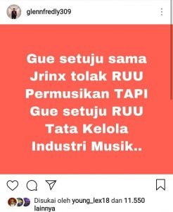 “Gue setuju sama Jrinx tolak RUU permusikan,” tulis Glenn dalam Instagramnya.