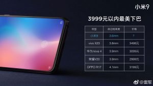 Lei Jun, CEO Xiaomi, bahkan mengklaim ukurannya lebih kecil dari sejumlah perangkat seperti Vivo X23, Huawei Nova 4, Honor View 20, serta Oppo R17. Hal tersebut tampak dari unggahan dari akun Weibo miliknya.