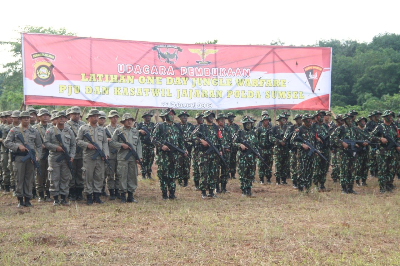 Palembang, lamanqu.com – Kepolisian Daerah Sumsel menggelar latihan One Day Jungle Warfare. Latihan itu dipusatkan di kawasan hutan Kecamatan Rambutan, Banyuasin, Sabtu 22 Februari 2020.