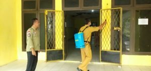 Seorang pegawai sedang tunaikan tugas semprot disinfektan di kantor dinsos