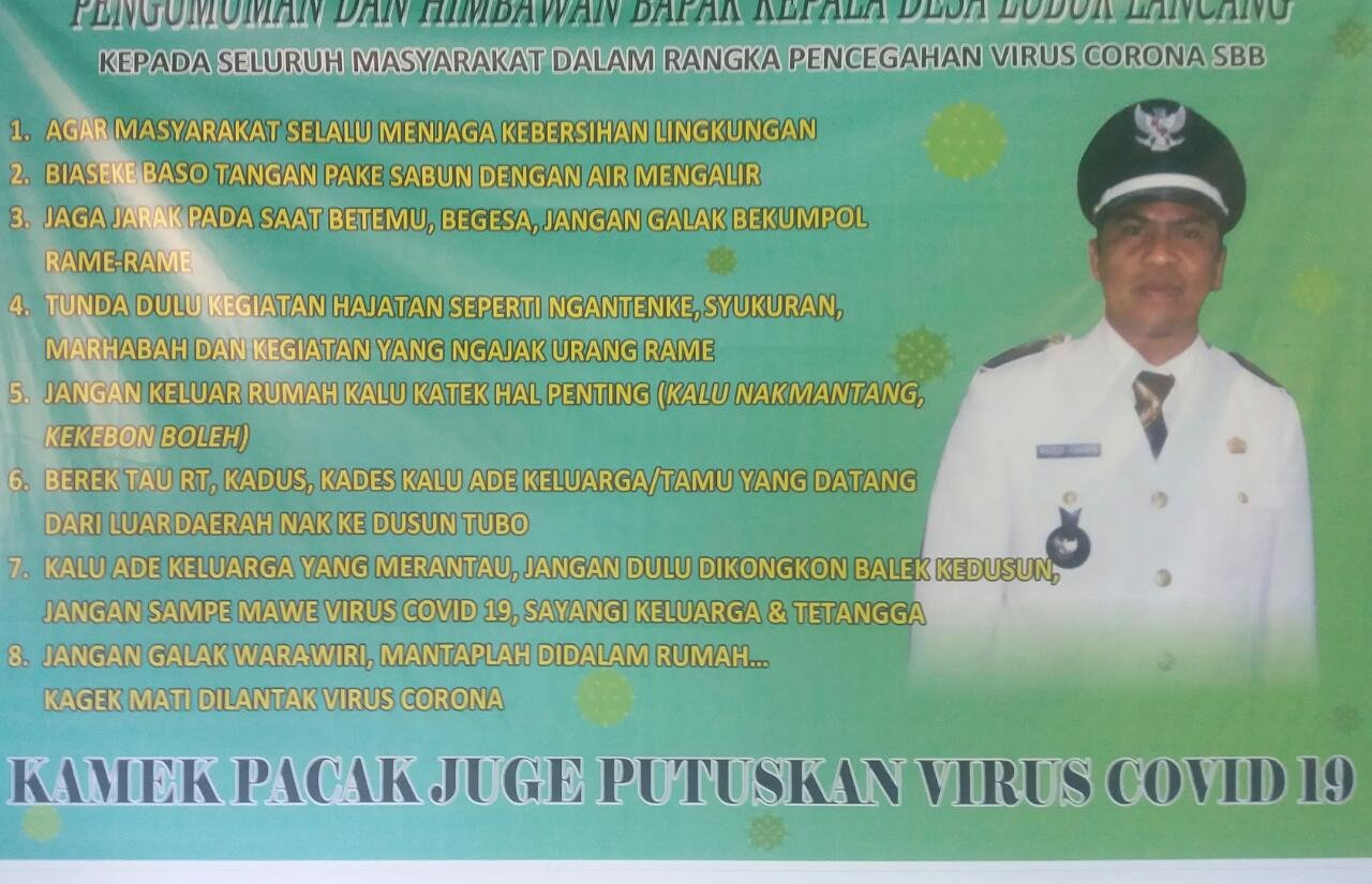 Seperti halnya yang dilakukan oleh Pemerintah Desa Lubuk Lancang Kecamatan Suak Tapeh Kabupaten Banyuasin. Dimana Kades Lubuk Lancang Rusdi Tamrin, terus gencar memberikan imbauannya kepada warga baik melalui imbauan tertulis maupun imbauan langsung melalui para RT dan para Kadus.
