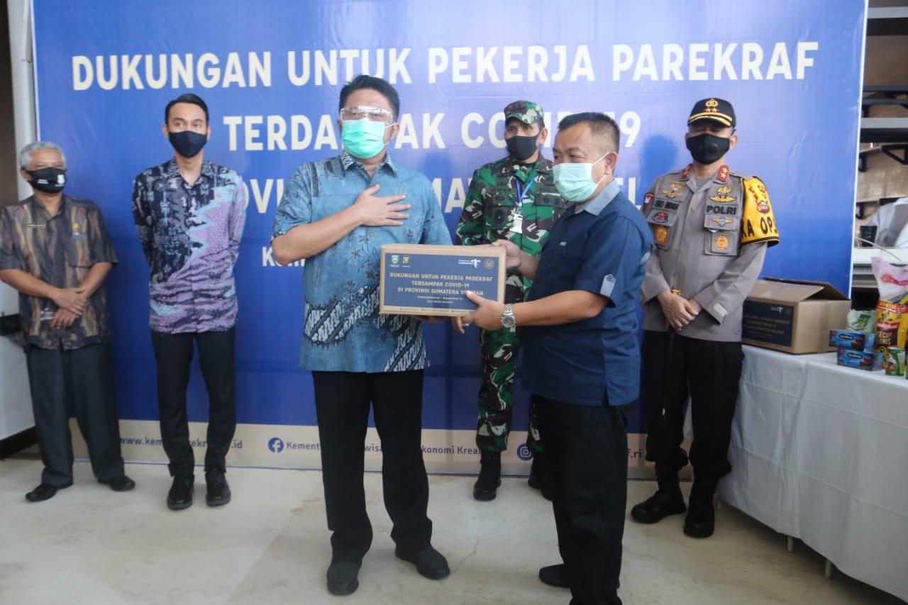 Paket bantuan berupa bahan pokok tersebut diserahkan oleh Deputi Bidang Produk Wisata dan Penyelenggaraan Kegiatan Kemenparekraf Rizki Handayani.