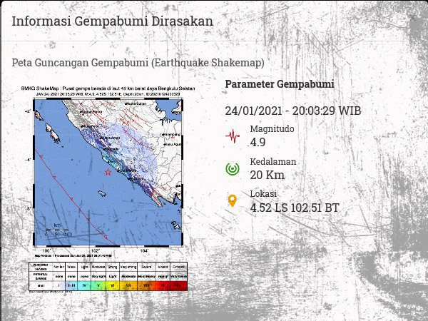 Sebagaimana diketahui, gempa tektonik dengan Magnitudo (M=) 4,9 mengguncang Provinsi Bengkulu, Minggu 24 Januari 2021, pukul 20.03 WIB. Di mana, episenter terletak pada koordinat 4.52 Lintang Selatan (LS) dan 102.51 Bujur Timur (BT).