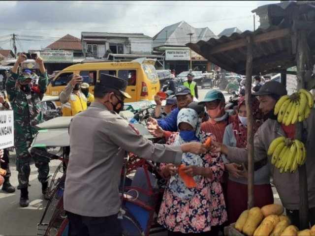 Pantauan dilapangan, terlihat rombongan Kapolda tiba dan langsung menuju berjalan ke arah pasar Sungki Kertapati. Kapolda langsung membagikan masker kepada pedagang maupun pembeli yang ada di pasar tersebut satu persatu.