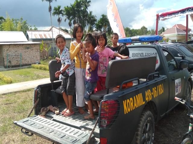 Tanpa ragu sejumlah anak menaiki mobil dinas yang sedang terparkir. Terpancar kebahagiaan anak-anak saat menaiki mobil dinas tersebut.