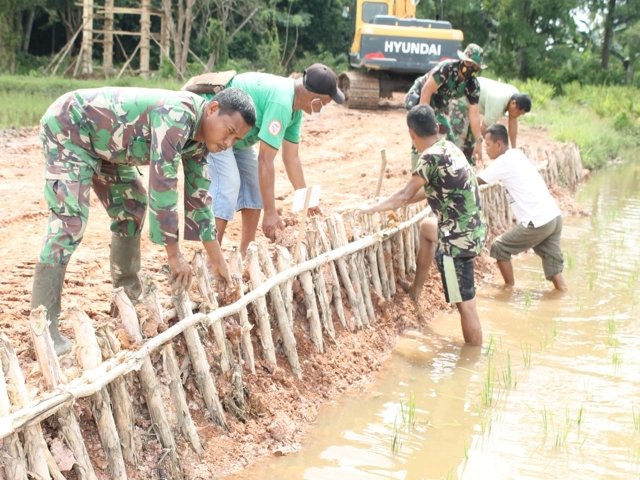 Palembang, lamanqu.com – Agar menghindari longsoran pada pelebaran jalan sepanjang sepanjang 750 meter. Satgas TMMD dan warga kampung Jawi secara gotong royong lakukan pemasangan pancang kayu sebagai penopang kanan kiri jalan tersebut.