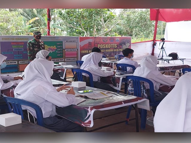 Hari ini, satgas TMMD tengah menyediakan ruang belajar bagi para pelajar dari SMA Dharma Bahkti. Dengan memanfaatkan poskotis TMMD sebagai tempat pelajar dengan pedoman protokol kesehatan.