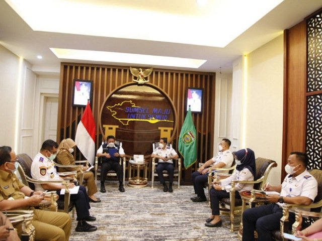 Palembang, lamanqu.com – Gubernur Sumsel H Herman Deru menerima anjangsana Kepala Balai Pengelolaan Light Rail Transit (LRT) Sumsel di ruang tamu Gubernur Sumsel, Senin (19/4/21).