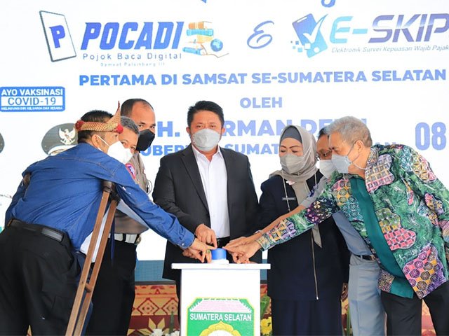 Palembang, lamanqu.com – Gubernur Sumsel H Herman Deru melaunching Pojok Baca Digital dan Aplikasi Elektronik Survei Kepuasan Wajib Pajak (E-SKIP) bertempat di Kantor Samsat Wilayah Palembang III KM 9.5 Komplek Ruko Bandara Mas Kecamatan Alang-alang Lebar Palembang, Kamis (8/7/2021).