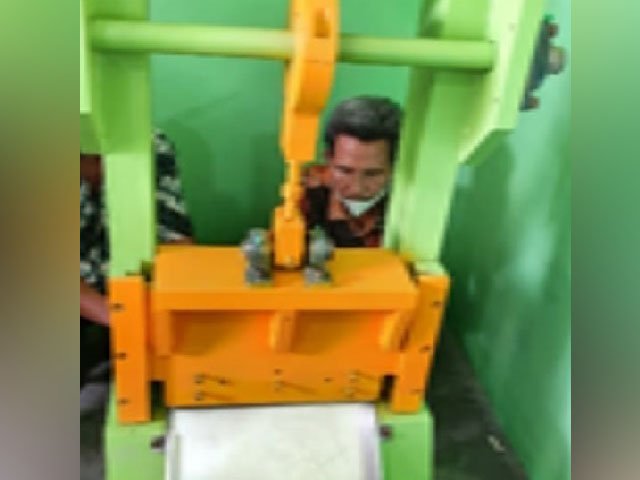 “Nah, karet seperti itu akan divulkanisasi dan pigmen untuk mewarnainya serta meningkatkan elastisitas karet gelang yang dihasilkan.Setelah itu baru karet digiling dalam mesin ekstruder dalam bentuk karet panjang dari pipa berlubang mesin.Dari bentuk pipa karet ini selanjutnya mesin akan memotong karet kecil-kecil, hinggahmenjadi karet gelang yang kita lihat. Mesin ini juga mampu membuat berbagai macam ukuran karet gelang, mulai besar hingga kecil, dari yang tebal hingga tipis. Karet yang dihasilkan mesin ini juga dapat dibuat berwarna-warni dengan menambahkan bahan pewarnanya”, kata anggota perancang mesin Afrizal Vachlepi, S.Tp. M.T.