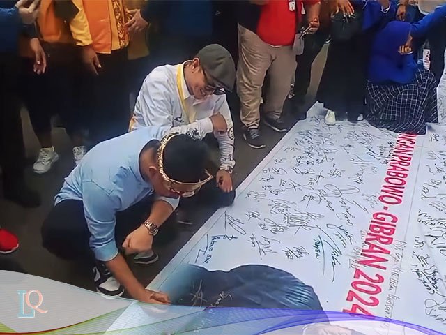 Palembang, lamanqu.com – Usai menghadiri acara konsolidasi Koalisi Indonesia Maju (KIM) Calon Wakil Presiden (Cawapres) Gibran Rakabuming Raka menyambangi stand banner relawan ‘Bersatu untuk Indonesia’, dan menandatangani dukungan pemenangan Prabowo-Gibran Pilpres 2024.