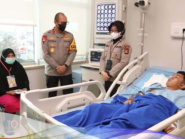 Kapolda Sumsel Irjen A Rachmad Wibowo Sik didampingi Dirintel Kombes Iskandar Fitriana, Dirlantas Kombes Pratama, Kabid Dokkes Kombes dr Syamsul Bahar dan Kabid Humas Kombes Sunarto saat menjenguk korban di RS Bhayangkara Polda pada Jumat (16/2/2024), mendapat penjelasan tentang kondisi korban yang sudah mulai siuman dan penanganannya oleh tim medis.