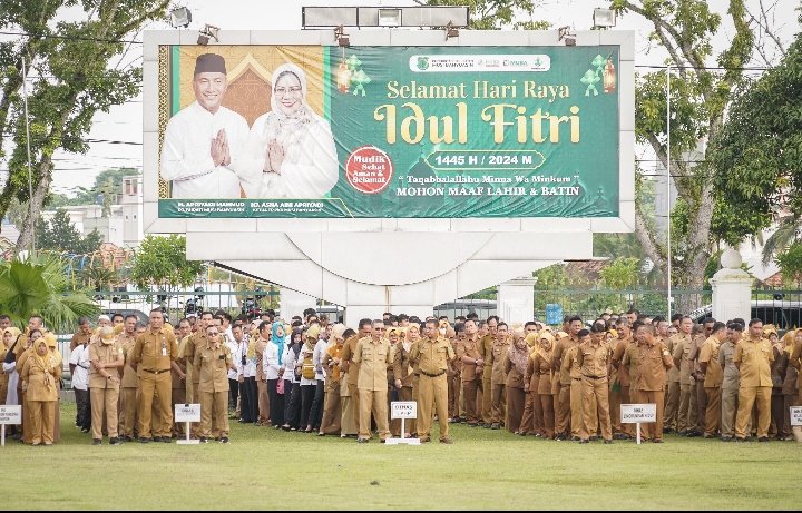 SEKAYU,lamanqu.com- Mengawali kegiatan setelah libur Lebaran Idul Fitri 1445 H tahun 2024, Pemerintah Kabupaten Musi Banyusain (Muba) gelar Apel Bersama dan Halal Bihalal bersama seluruh Jajaran ASN, Honorer dan Tenaga Kontrak di Lingkungan Pemkab Muba, bertempat di Halaman