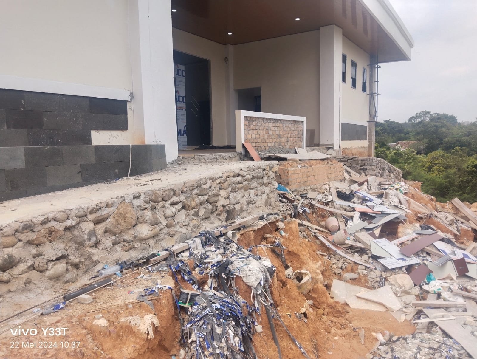 “Cek pagar sekalian dinding penahan tanah jebol atau ambles dan pondasi pada bagian belakang gedung patah dan dinding gedung banyak kelihatan nya retak retak hingga mengkhawatirkan untuk pengguna gedung nanti nya, “tambah dia.