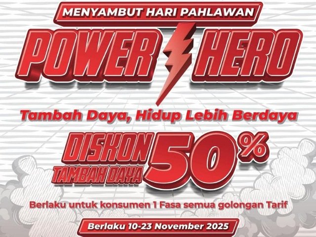 Jakarta, LamanQu.Com – Dalam semangat memperingati Hari Pahlawan 2025, PT PLN (Persero) menghadirkan program promo bertajuk “Power Hero”, yang memberikan diskon 50% untuk biaya tambah daya listrik bagi pelanggan setia. Promo ini berlangsung secara nasional mulai 10 hingga 23 November 2025 dan dapat diakses dengan mudah melalui aplikasi PLN Mobile.