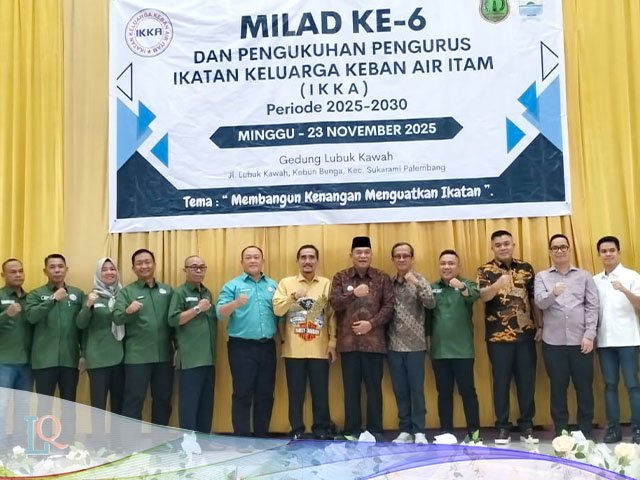 Palembang, LamanQu.com – Peringatan Milad ke-6 sekaligus Pengukuhan Pengurus Ikatan Keluarga Keban Air Itam (IKKA) Periode 2025–2030 berlangsung khidmat di Gedung Lubuk Kawah, Minggu (23/11/2025). Dengan mengusung tema “Membangun Kenangan, Meningkatkan Ikatan”, kegiatan ini menjadi momentum penting untuk mempererat kebersamaan keluarga besar Keban Air Itam yang berdomisili di Kota Palembang dan sekitarnya.
