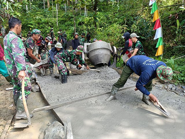 Cangkul menghentak tanah, molen berputar tanpa henti, dan adukan semen dituang dengan sigap ke badan jalan. Anggota Satgas TMMD berpacu dengan bayang-bayang hujan, memastikan pengecoran rabat beton rampung sebelum langit benar-benar menumpahkan isinya.