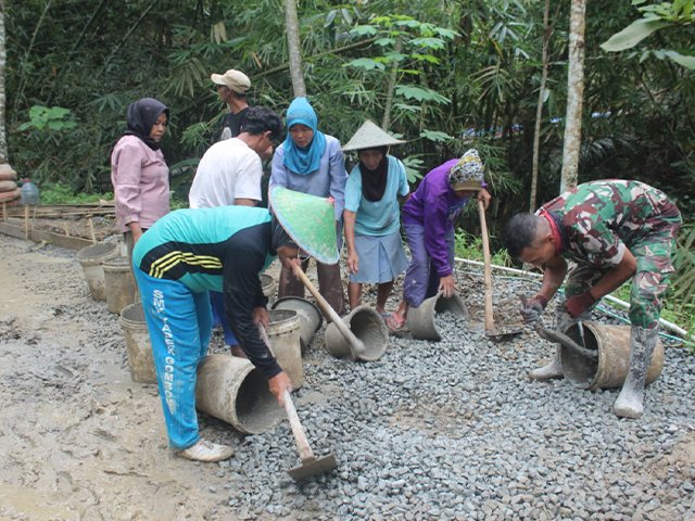 Tak ada sekat antara prajurit dan warga. Bapak-bapak mengangkat koral, prajurit menuang adonan, yang lain meratakan beton dengan teliti. Peluh jatuh bersama, menyatu dengan debu dan semangat yang tak surut. Gotong royong hari itu bukan hanya tentang membangun jalan, tetapi tentang meneguhkan rasa memiliki dan cinta pada desa sendiri.